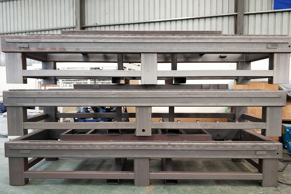 數控開料機床身全部都是采用整體的8MM的整體鋼板焊接,焊接完成后經過打磨,以及后期的回火和噴砂處理。再由公司斥巨資引進的大型五面銑設備進行齒條安裝面、導軌安裝面及定位裝置安裝面的加工,這樣大大保證了機器裝配精度,提供機器的加工精度和使用壽命。 反之一些小廠家沒有專業的設備來進行床身的加工,只能胡亂吹噓,對客戶說的天花亂墜,但是沒有實質性的證明。